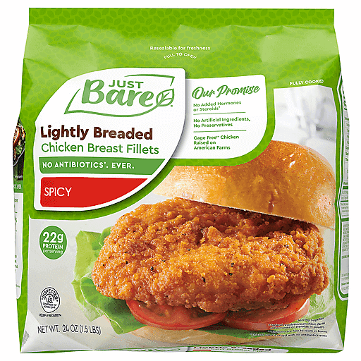 Skip the drive-through and create a delicious spicy chicken sandwich at home with our Lightly Breaded Chicken Breast Spicy Fillets. Made with boneless chicken breast fillets and packed with protein, our spicy fillets are marinated and breaded in a spicy, southern style for a peppery and slightly sweet heat. Just heat and serve for a premium, restaurant-quality meal in record time. As always, Just Bare® provides chicken that features no antibiotics, ever*. Has no added hormones or steroids†. Uses no artificial ingredients or preservatives and uses chickens raised cage free on American farms‡. *Chicken used is raised with no antibiotics ever, +Federal Regulations prohibit the use of hormones or steroids in poultry. ‡Chickens free to roam in barns.